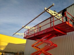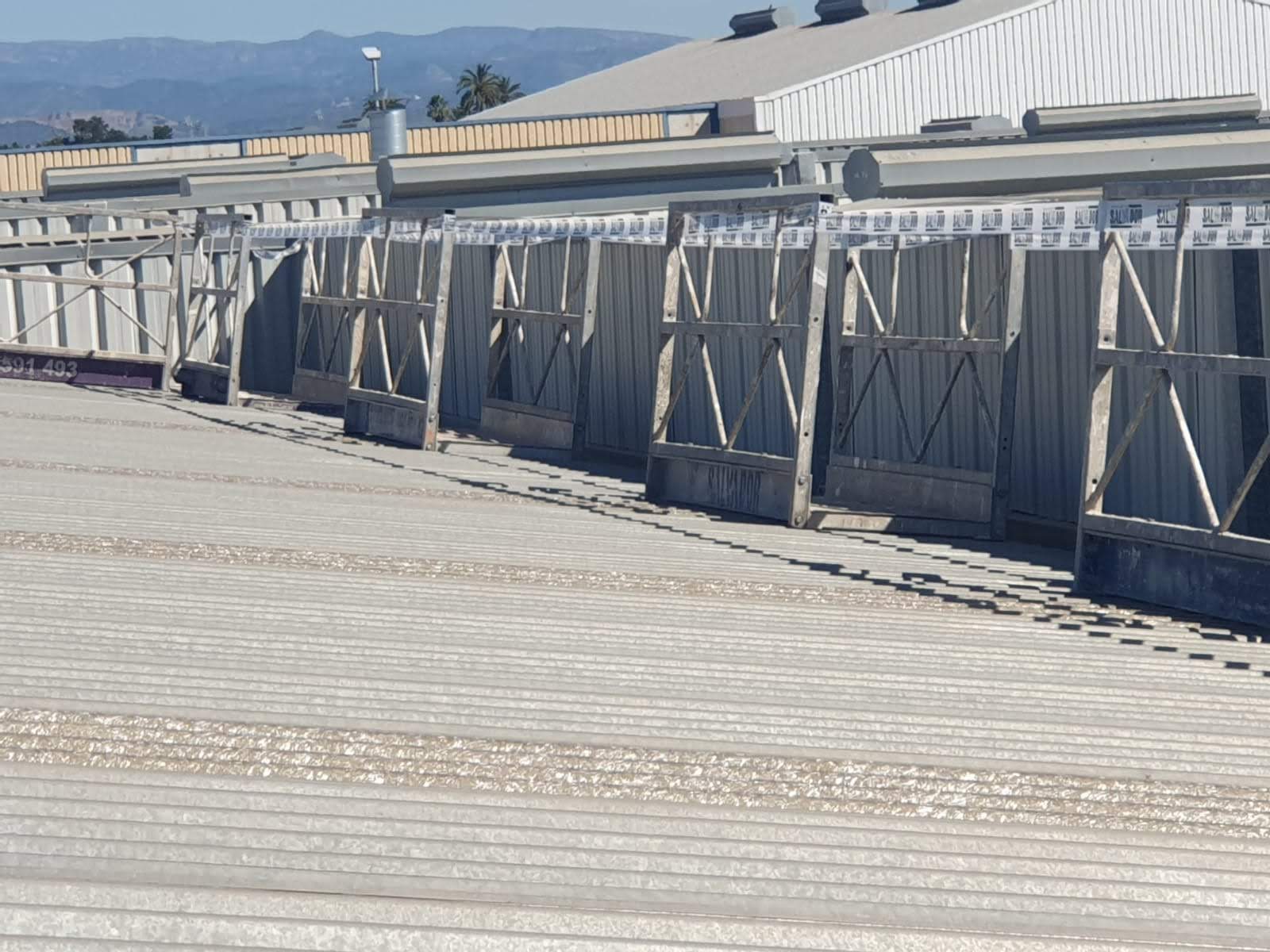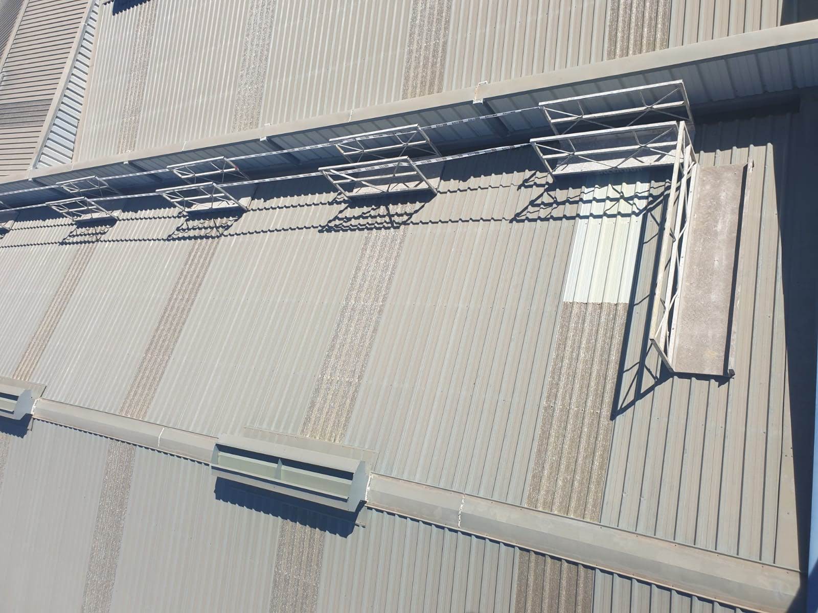 Hay que recordar, que siempre que sea posible, debemos optar por esta última solución. En este caso para unos trabajos puntuales de instalación de una salida de humos, hemos montado unas protecciones colectivas provisionales consistentes en unas plataformas con barandilla las cuales protegen del riesgo de caída tanto por lucernarios como por el perímetro de la nave. Sin duda se trata de una solución sencilla, efectiva y económica.